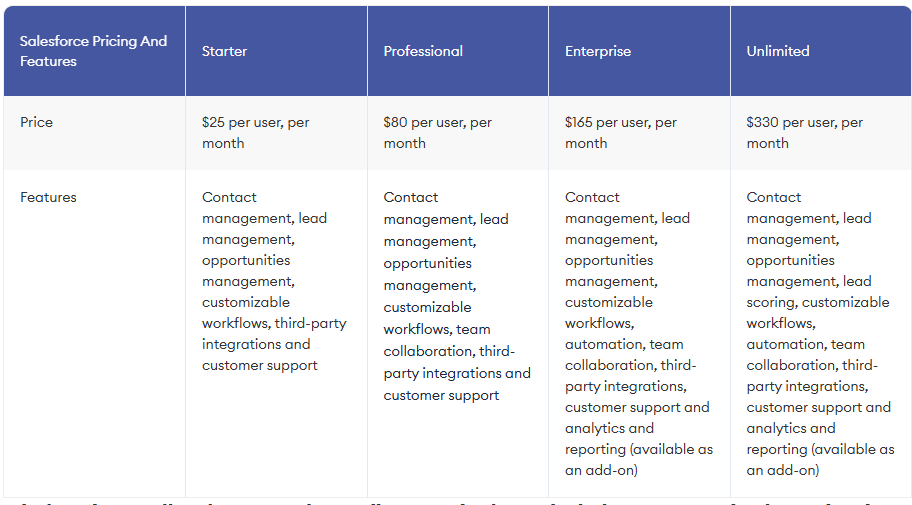 Salesforce는 무료 버전을 제공하지 않지만, 제품 데모를 통해 연장 가능한 30일 무료 체험판을 제공합니다. 이 CRM 소프트웨어는 최소 1년 계약이 필요합니다. 또는 Salesforce unlimited+를 선택할 수 있으며, 여기에는 성과 관리 및 슬랙을 통한 팀 협업과 같은 추가 기능과 패키지 맞춤 설정 옵션이 포함됩니다.