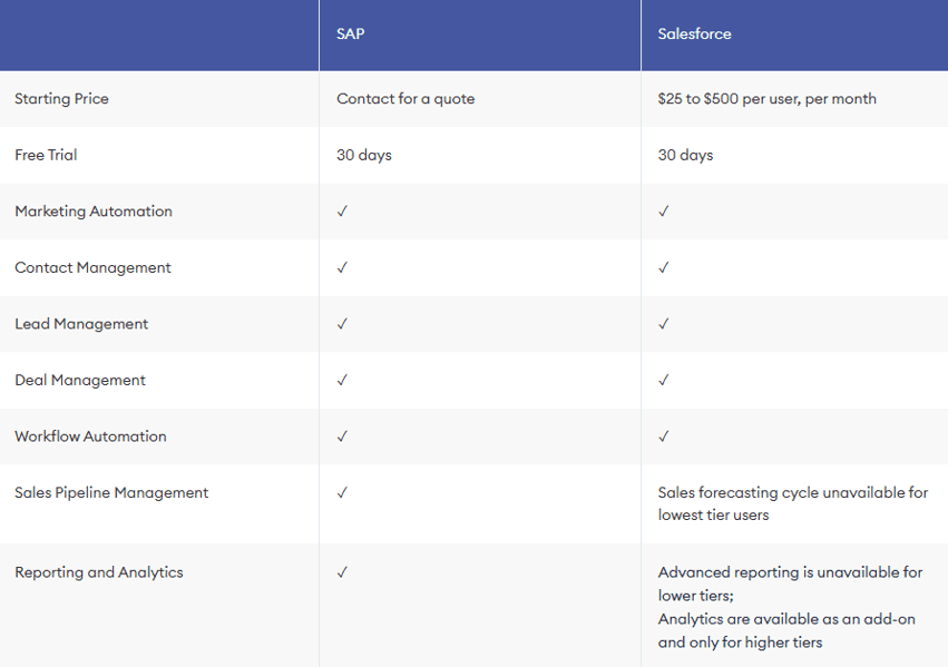 다만 Salesforce의 고급 워크플로우 및 CRM 자동화 기능은 상위 요금제에서만 제공됩니다. 또한 지오태깅 같은 일부 기능은 Salesforce 외부 연동이 필요한 반면, SAP는 이러한 기능을 기본적으로 포함합니다.