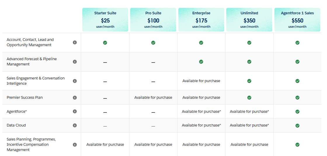 Salesforce 세일즈 클라우드에는 네 가지 요금제가 있습니다: 스타터 스위트(Starter Suite)는 사용자당 월 25달러, 라이트닝 프로페셔널(Lightning Professional)은 100달러, 라이트닝 엔터프라이즈(Lightning Enterprise)는 175달러, 라이트닝 언리미티드(Lightning Unlimited)는 350달러, 라이트닝 언리미티드+(Lightning Unlimited+)는 550달러입니다. 스타터 스위트는 기본 기능과 모든 수준에서 이용 가능한 Salesforce 분석이 필요한 소규모 기업에 적합합니다.